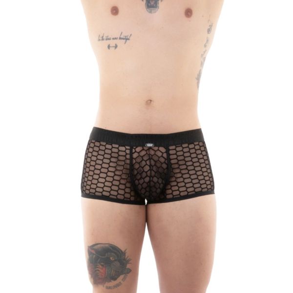 boxer in tessuto floccato nero su base di tulle trasparente, con un disegno che richiama un alveare;