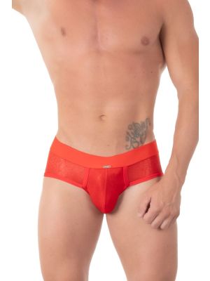 Intimo maschile in tulle rosso trasparente, impreziosito da un raffinato motivo a ragnatela che valorizza le forme del corpo.